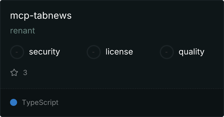 Name = mcp-tabnews Type = command Command = npm exec -- @smithery/cli@latest run @renant/mcp-tabnews